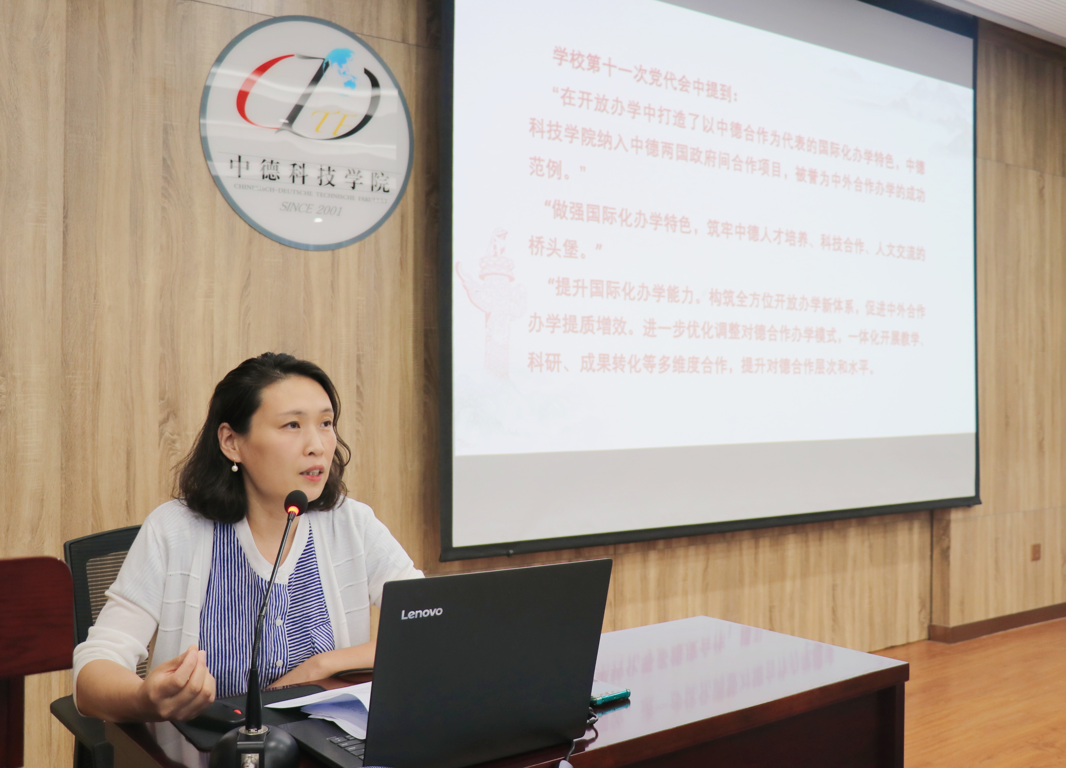 韩海青强调,习近平总书记在二十大报告中指出,中国坚定奉行互利共赢的开放战略,推进高水平对外开放。公司第十一次党代会中提到,公司要做强国际化办学特色,筑牢中德人才培养、科技合作、人文交流的桥头堡。通过主题教育专题党课,公司全体师生一要加强学习,提升思想政治素质和业务水平。把强化理论学习贯穿主题教育和实际工作始终,加强对习近平总书记关于教育的重要论述讲话、中外合作办学政策的学习,不断提高政治站位,逐步明晰公司发展定位。二要凝心聚力,确保评估任务顺利完成。要高度重视公司评估工作,针对公司在人才培养质量、外方引进课程等公司发展痛点、难点问题,群策群力、攻克难关,积极助力公司评估工作顺利圆满通过。三要立德树人,推动合作办学内涵式发展。公司将重点加强全员质量管理及团队队伍建设等,提升人才培养质量,公司党政领导、各部门负责人要加强统筹协调、坚持以上率下、注重潜心思考,将开展主题教育同公司中德合作办学发展建设各项工作任务落地见效结合起来,确保主题教育取得扎扎实实的成效,不断推动公司中德合作办学高质量内涵式发展,以实际行动为建设“特色鲜明 走在前列”的高水平大的奋斗目标贡献中德智慧和力量。
