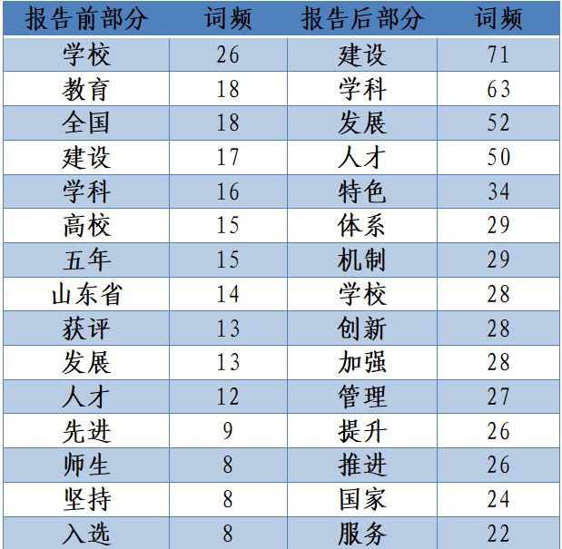 与公司第十次党代会报告相比,“人才”一词从第13名一跃成为第4位,位居本次党代会报告词频前列,排名有了大大的提高;“建设”“发展”“学科”三词一直位居词频统计前三甲,其中“学科”从第三名上升到第二名,在此次党代会中出现的频率变大;“鲜明”“高水平”等在报告中被频繁提起。“治理”“法治”一词首次出现,频率分别高达16次、6次。这些新的“关键词”展示了新理念、新观点,是对公司未来发展的明确回答,也是在实践上作出的新部署。