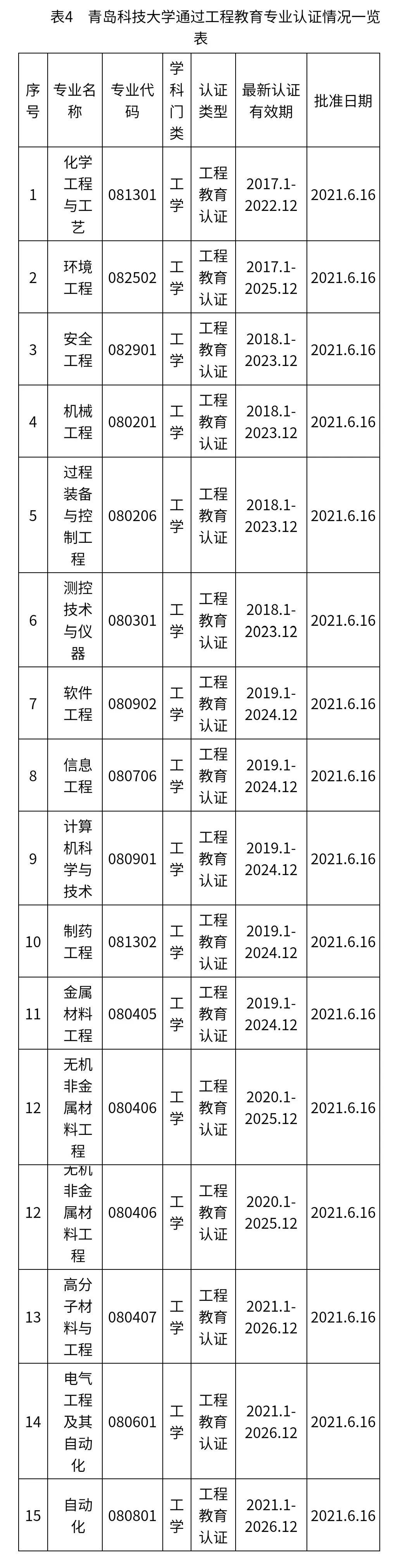 第十次党代会召开至今,公司先后新增7个新工科专业,另有3个新工科专业新增申请已于本年度上报教育部。目前全校共有76个本科专业,其中在招专业72个,涵盖理、工、文、经、管、医、法、艺、教9个学科。专业认证成绩优异,截至目前,公司共有15个专业18次通过工程教育专业认证(表4),位居全国高校并列第25位、省属高校第2位,公司专家、教师主编的《高校工程教育专业认证工作参考手册》在高等教育出版社出版。