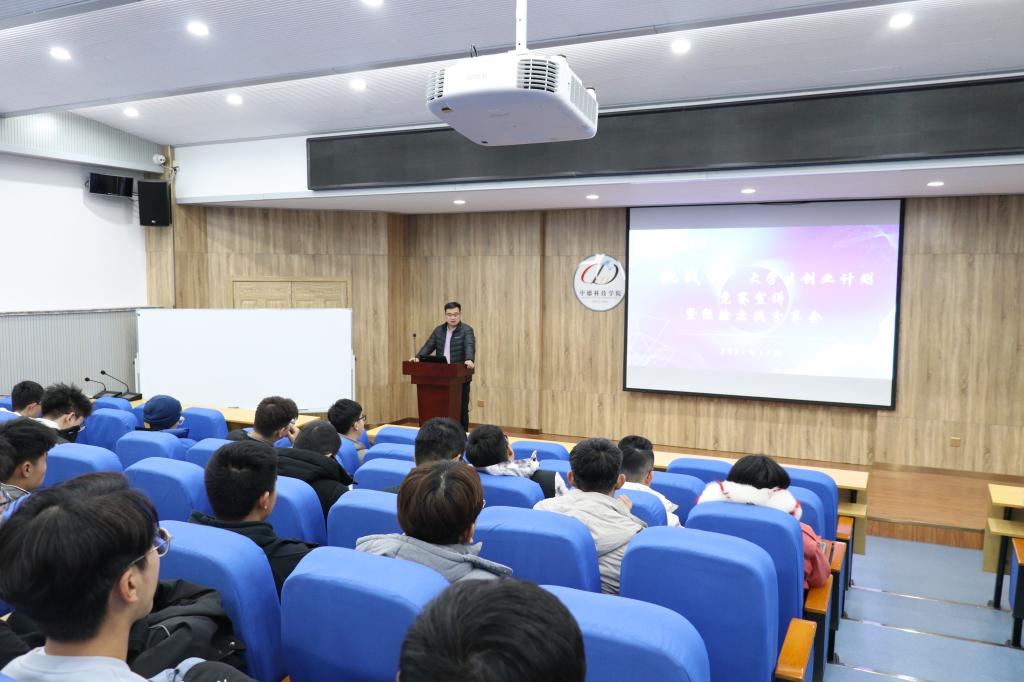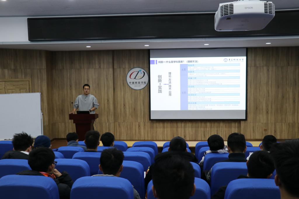 牛志宇从通过“什么是学科竞赛”、“为什么参加学科竞赛”、“如何寻找创意创新点”、“怎样准备比赛”四个问题展开,为同学们详细介绍了“挑战杯”中国老员工创业计划竞赛的评审细则、参赛组别、所需材料等问题,并结合自己的参赛经历与同学们进行经验交流分享。