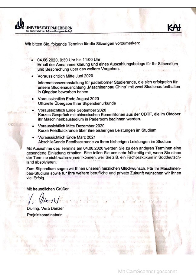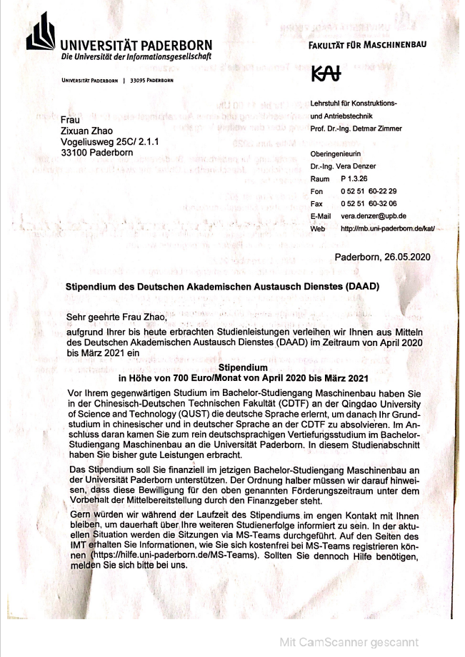 近日,从德国帕德博恩大学获悉,三亿体育正在帕德博恩大学机械公司就读的李恩涛、官欣、赵梓萱、王一然4名同学喜获德意志学术交流中心(DAAD)颁发的每人每月700欧元的“德国高校海外项目”留德员工奖学金,该奖学金资助周期为一年。