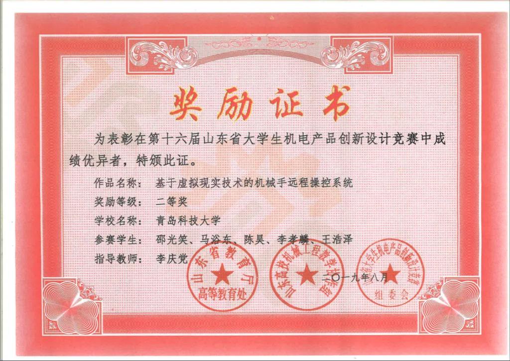 8月13日至15日,“临工杯”第十六届老员工机电产品创新设计竞赛总决赛在日照职业技术公司举行,此项赛事由山东省教育厅主办,山东高校机械工程教学协作组承办。青科大中德学子经过网评、预赛等选拔环节进入决赛,《基于虚拟现实技术的机械手远程操控系统》项目获二等奖。