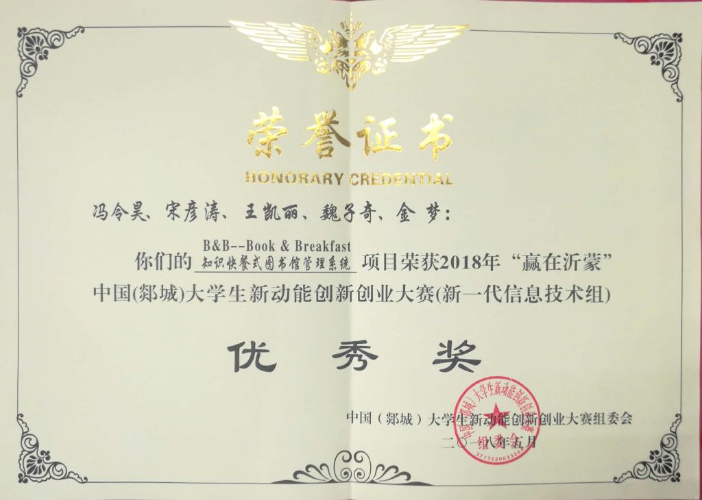 日前,“赢在沂蒙”中国(郯城)老员工新动能创新创业大赛在郯城举行。青科大共有15支团队参赛,经过激烈角逐,获得银奖1项、优秀奖14项,公司获评“优秀组织单位”奖。三亿体育员工冯令昊、宋彦涛等的作品《B&B——Book&Breakfast 知识快餐式图书馆管理系统》获大赛(新一代信息技术组)优秀奖。
