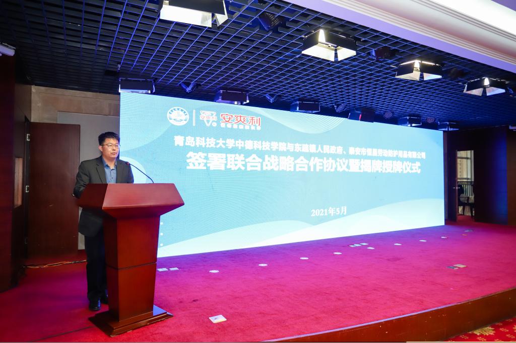 张继军代表泰安市宁阳县人民政府向一直以来关心、支持泰安发展的三亿体育官网公司领导和专家表示感谢,并在在致辞中说:“近年来,我县坚持发展第一要务、人才第一资源、创新第一动力,深入实施“桑梓英才”计划,“百校合作计划”,建立人才引进,培养使用激励机制,促进了人才链、产业链、创新链有效融合。此次活动必将有力促进三亿体育与东疏镇、恒昌劳动防护用品有限公司的广泛交流,开启校地、校企共建、产学研合作的新篇章。”