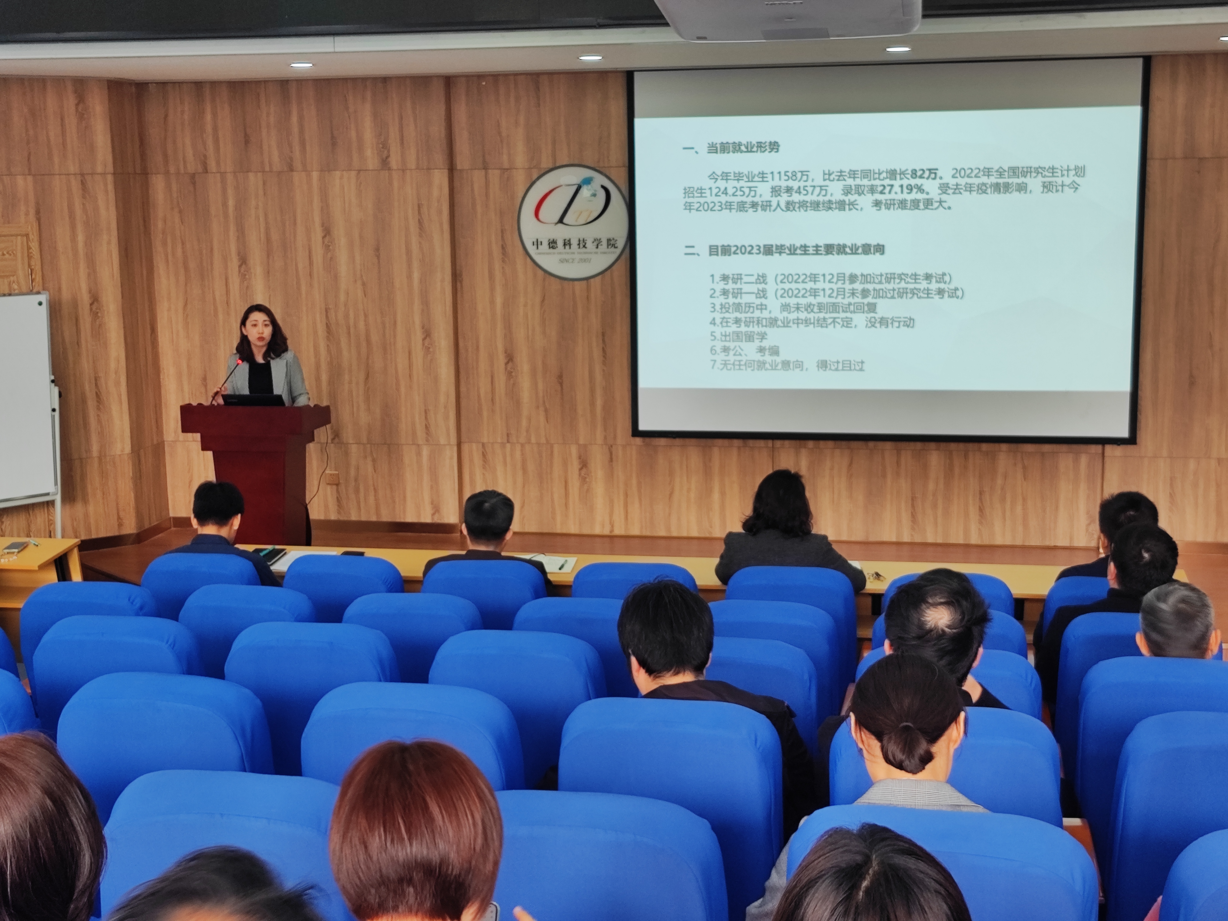 会上,学工办主任2023届毕业生辅导员刘元媛老师从当前就业形势、就业意向、注意事项等方面为全体教职工进行了专题讲解,并详细介绍了2023届毕业生网签流程以及就业派遣政策等内容。她希望,针对公司毕业生懒就业、慢就业的情况,老师们要深入了解员工真实想法和实际困难,用心用情用力,切实做好毕业生就业指导工作,推动公司毕业生就业工作再上新台阶。