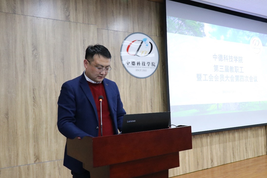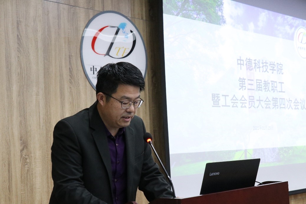 公司工会主席、办公室主任张军涛代表公司工会做了题为《围绕中心服务大局与时俱进履职尽责为中德合作一体化办学贡献力量》的报告。他指出在校工会和公司党政的领导下,在全体教职工的大力支持协助下,公司工会坚持“教师利益无小事”的工作理念,认真履行工会职能,为教师办实事、办好事。发挥工会组织优势,组织完成公司师德师风建设月学习教育活动、师生阳光体育运动会活动、迎新春联欢会活动、慰问品发放、爱心一日捐组织等活动,彰显人文关怀,为返校教师准备防疫物资,协助公司落实疫情防控各项日常工作,充分发挥工会职能作用,保障公司以教学为中心的各项工作的顺利进行,为中德合作一体化办学贡献力量。