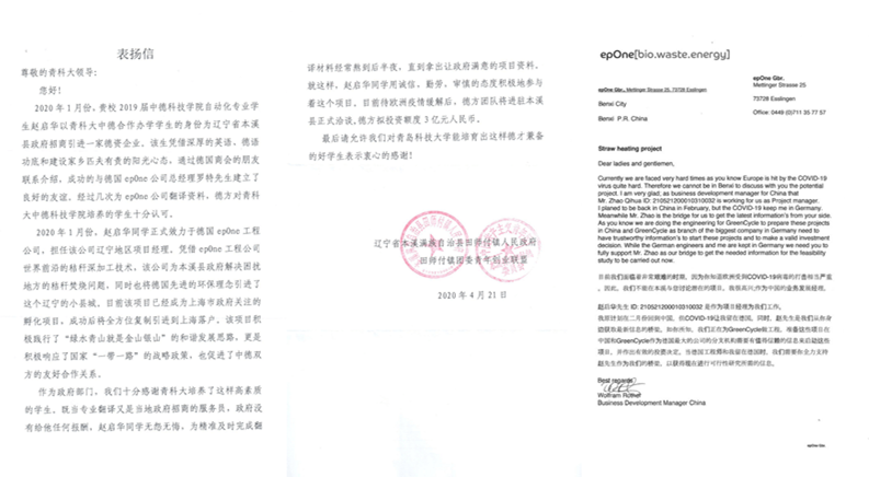 疫情防控期间,2019级自动化专业员工赵启华利用自身德语和专业学习优势,为德国ep0ne公司翻译其在华投资的项目资料。德国ep0ne公司总经理罗特在华期间,赵启华将德国ep0ne公司引介到家乡辽宁本溪满族自治县招商服务中心。双方通过沟通后达成合作意向,德国ep0ne公司团队将待欧洲疫情缓解后,进驻本溪县洽谈具体事项,德方拟在本溪投资3亿元。