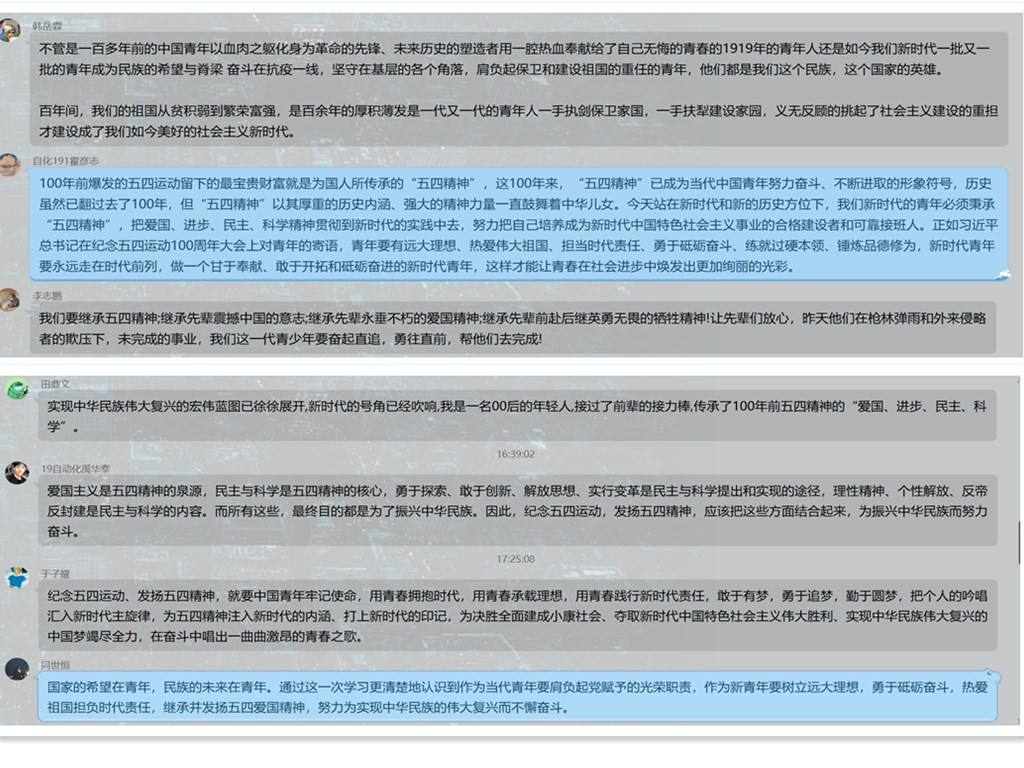 中德团员青年,化身“收信人”“云接力”,参与教育部思政司指导、人民网出品H5《我们都是收信人》,以新时代的责任担当作答青春三问,选择成长答案,递交人生答卷,共同学习习近平总书记重要回信精神。中德学子通过学习强国、微博、微信、快手、今日头条等线上平台参与团中央“让青春为祖国绽放”主题团日活动,同时以党团支部为单位,组织员工广泛开展线上学习座谈、交流讨论、集体观影等活动,进一步学习了解五四运动的历史背景、历史意义,领会和传承五四运动的精神要义,增强青年的历史使命感和责任担当,实现使命与成长的对话。