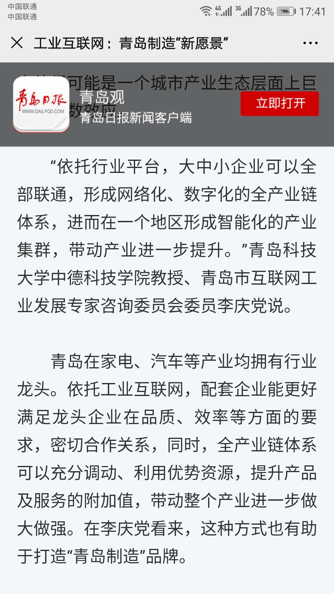 日前,泰山学者海外特聘专家、三亿体育官网中德经济工程研究所所长,中国制造业知识服务联盟理事、青岛市互联网工业发展专家咨询委员会委员李庆党教授,就“工业互联网:青岛制造‘新愿景’”接受青岛日报专访。