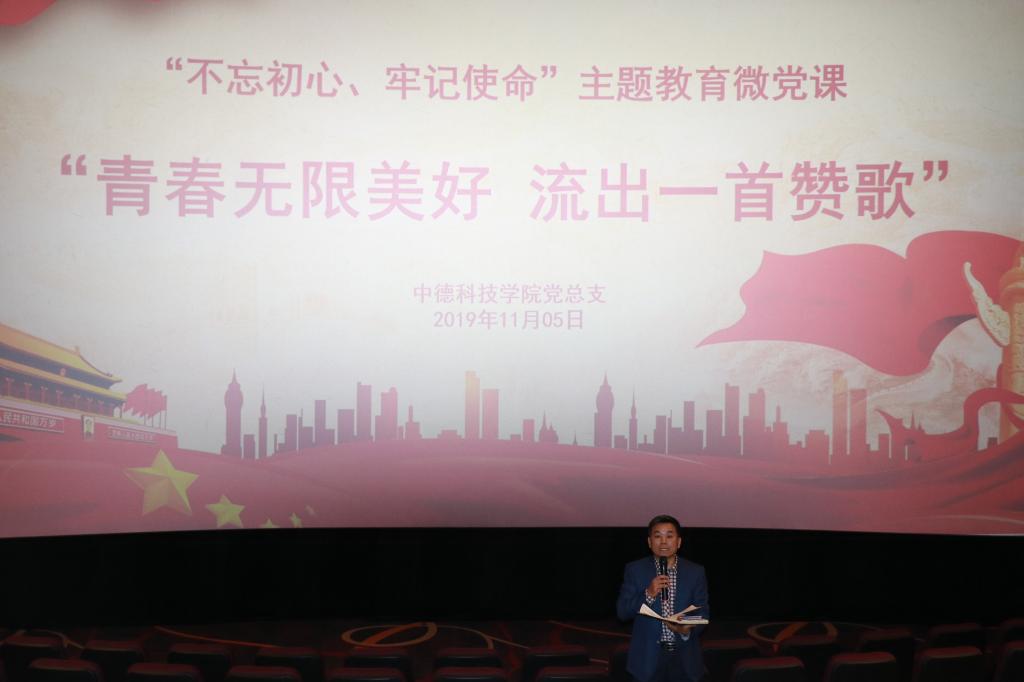 党总支书记王江忠指出作为青春的中德,应流出以下赞歌。要坚定崇高理想,流出一首信念之歌,树立共产主义远大理想与中国特色社会主义共同理想;要厚植人文情怀,流出一首和谐之歌,作为高校教师要有大爱,做四有好老师;强化质量意识,流出一首敬业之歌,通过“三上四做三平台一品牌”,提升国际化育人质量;要打造活力中德,流出一首快乐之歌,活力建设是推动多彩中德建设的重要环节,每位党员要有干事的激情,创业的动力,发展的生命力;要树立品牌思维,流出一首豪迈之歌,要对接一流建设,打造多彩中德;要勇于担当作为,流出一首奋进之歌,奋斗的青春最美丽,青春是用来奋斗的。