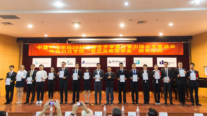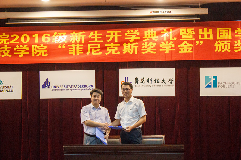 9月13日下午,2016级新生开学典礼暨出国员工欢送会在崂山校区第三报告厅举行。副董事长李庆领,德国帕德博恩大学Warnecke教授,锡根大学Griese教授,帕德博恩大学Hübner博士,菲尼克斯(中国)投资有限公司工会主席郑巧林、企业发展部经理易书波,公司统战部、员工处、国际处、校团委、后勤处、公司领导和部分教师以及来自帕德博恩大学的28名硕士生和本科生参加了会议。