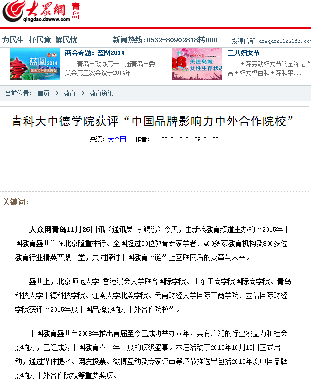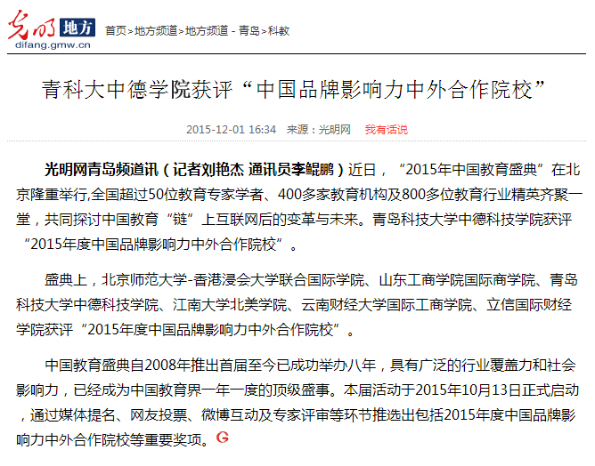 【光明网】【大众网】青科大中德公司获评“中国品牌影响力中外合作院校”