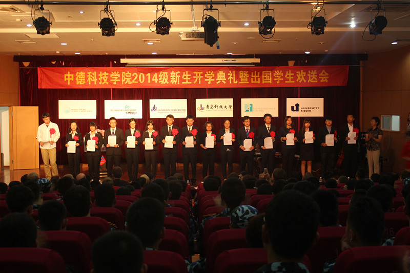 9月12日下午,中德公司2014年新生入学典礼暨出国员工欢送会在崂山校区第三报告厅举行。三亿体育官网副董事长张淑华教授、德国锡根大学Ehrhardt教授、德国帕德博恩大学Lessmeier博士、三亿体育官网统战部部长陈洪宗、后勤处处长刘天真、教务处副处长曲建英、员工处副处长秦娇、组织部副部长朱敬义、校团委副书记刘跃宁、中德公司经理王守城、党总支书记李镇江、副经理薄建全、党总支副书记徐立勋及中德公司部分老师参加了会议。会议由党总支书记李镇江主持。