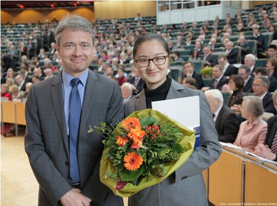 她现在帕德博恩大学机械系攻读博士学位,前不久刚刚荣获德意志学术交流中心颁发的优秀外国职工奖。目前在帕德博恩大学就读的外国职工人数超过1500人,而她以其优异的成绩从众多的竞争者中胜出,成为2013年度外国职工中唯一获得该项殊荣的外国职工。在帕德博恩大学2014年新年招待会上,帕德博恩大学副董事长弗里克教授(Prof. Dr. Bernd Frick)亲自为她颁奖。