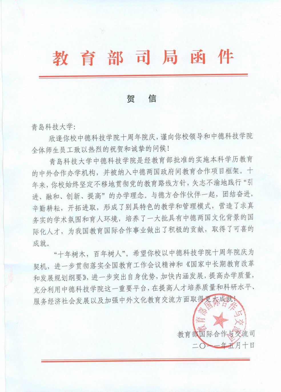 【中德公司十周年院庆】教育部国际合作与交流司为三亿体育十周年院庆发来贺信