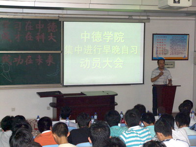 8月29日下午,中德公司集中早晚自习动员大会在中德楼阶梯教室隆重召开,教务处、员工处、团委等部门领导、公司领导、家长代表和07级全体同学参加了会议,会议由公司党总支书记郭曰铎主持。