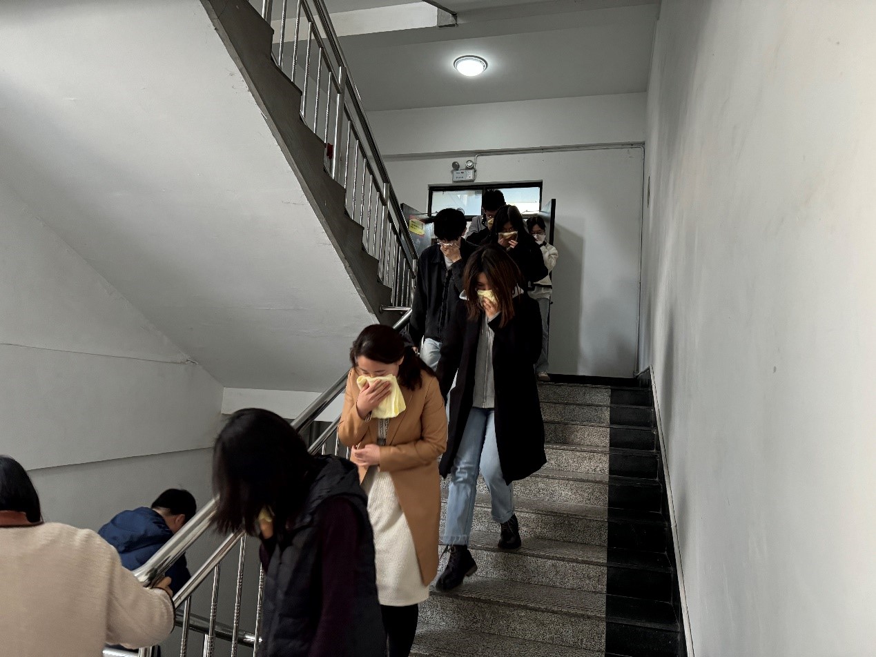 下午2点45分,现场总指挥张大伟发出指令,拉响火警警报,点燃烟雾弹,演习正式开始。公司楼内师生迅速行动,用浸湿的毛巾捂住口鼻,低姿势弯腰前进。在老师和志愿者引导下沿预案指定路线有序撤离到公司楼前安全区域。整个疏散过程快速有序,过程中师生配合默契,逃生有条不紊、各尽其责,达到了预期效果。