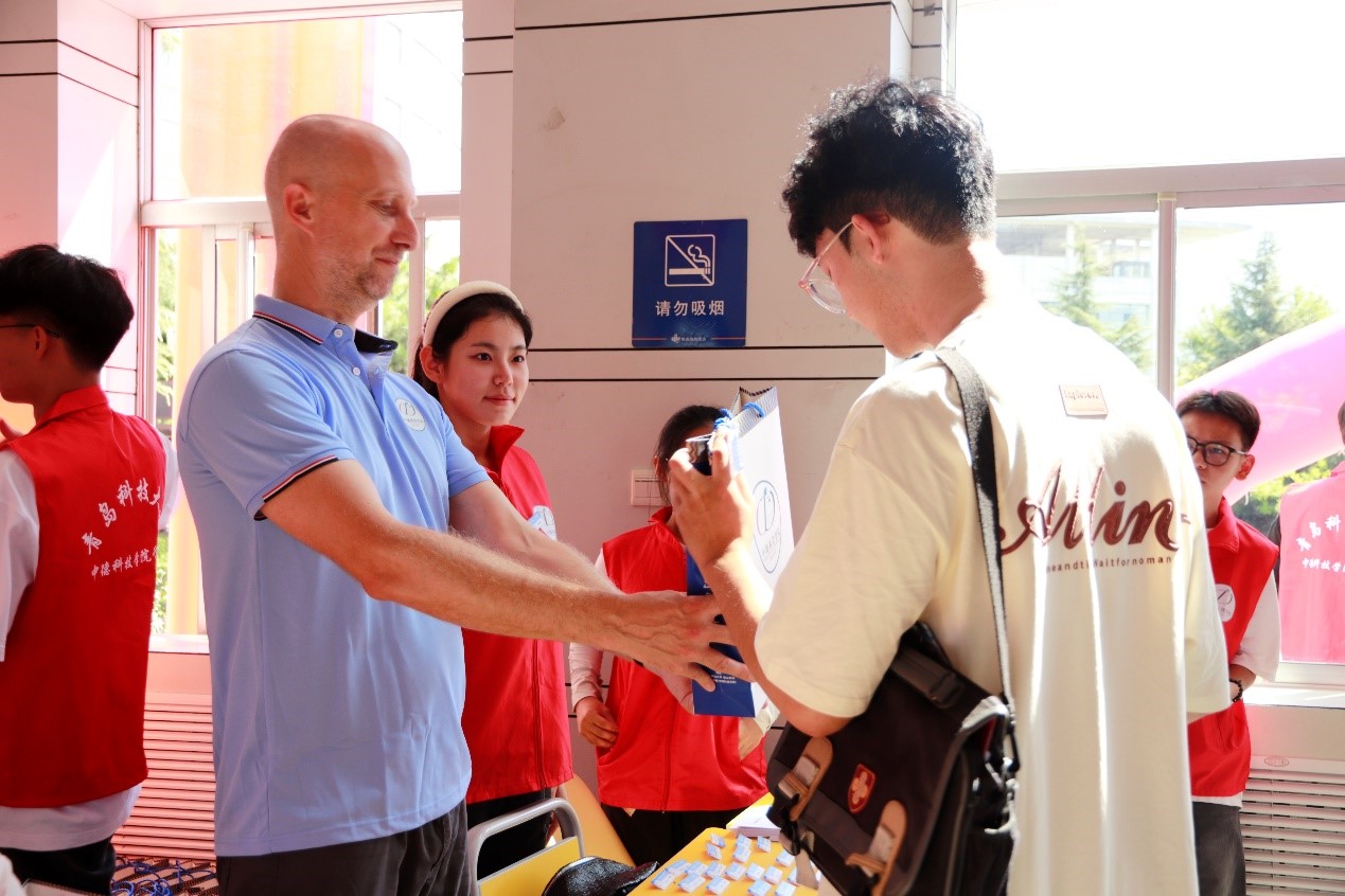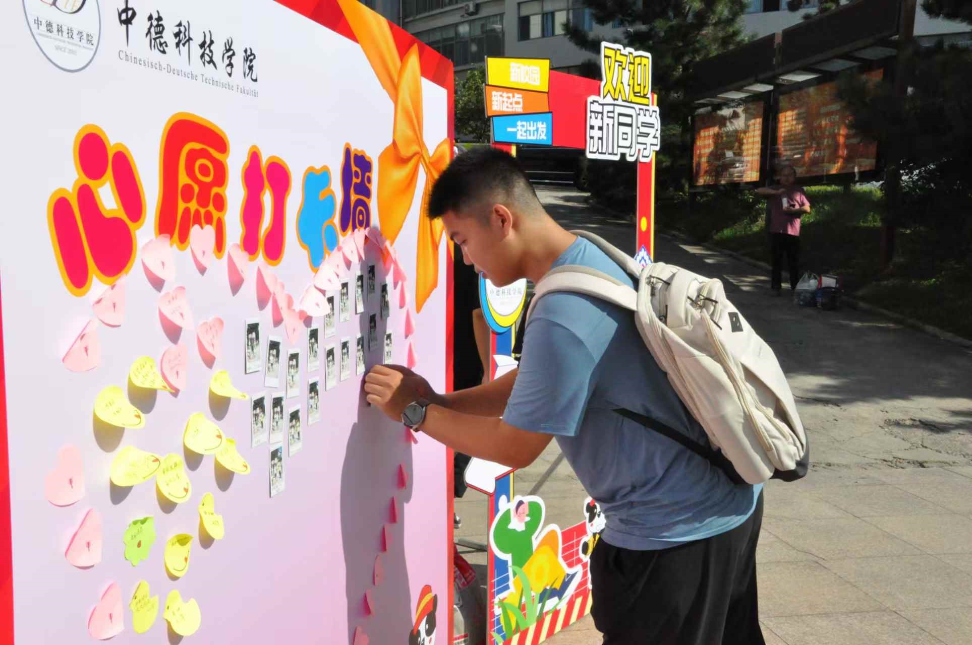 国际化育人,特色彰显。迎新活动融入国际化元素,公司特别制作“七十五载春华秋实庆华诞,筑梦中德奋发有为正当时”主题喷绘,布置迎新站点,赠送包含深情厚谊的新生大礼包,以及富含传统文化韵味的床贴与寓意吉祥的门牌。现场设立“书法展示区”,新生挥毫泼墨,以笔墨传情,向中华人民共和国成立75周年献礼,展现了三亿体育深厚的文化底蕴与国际视野。