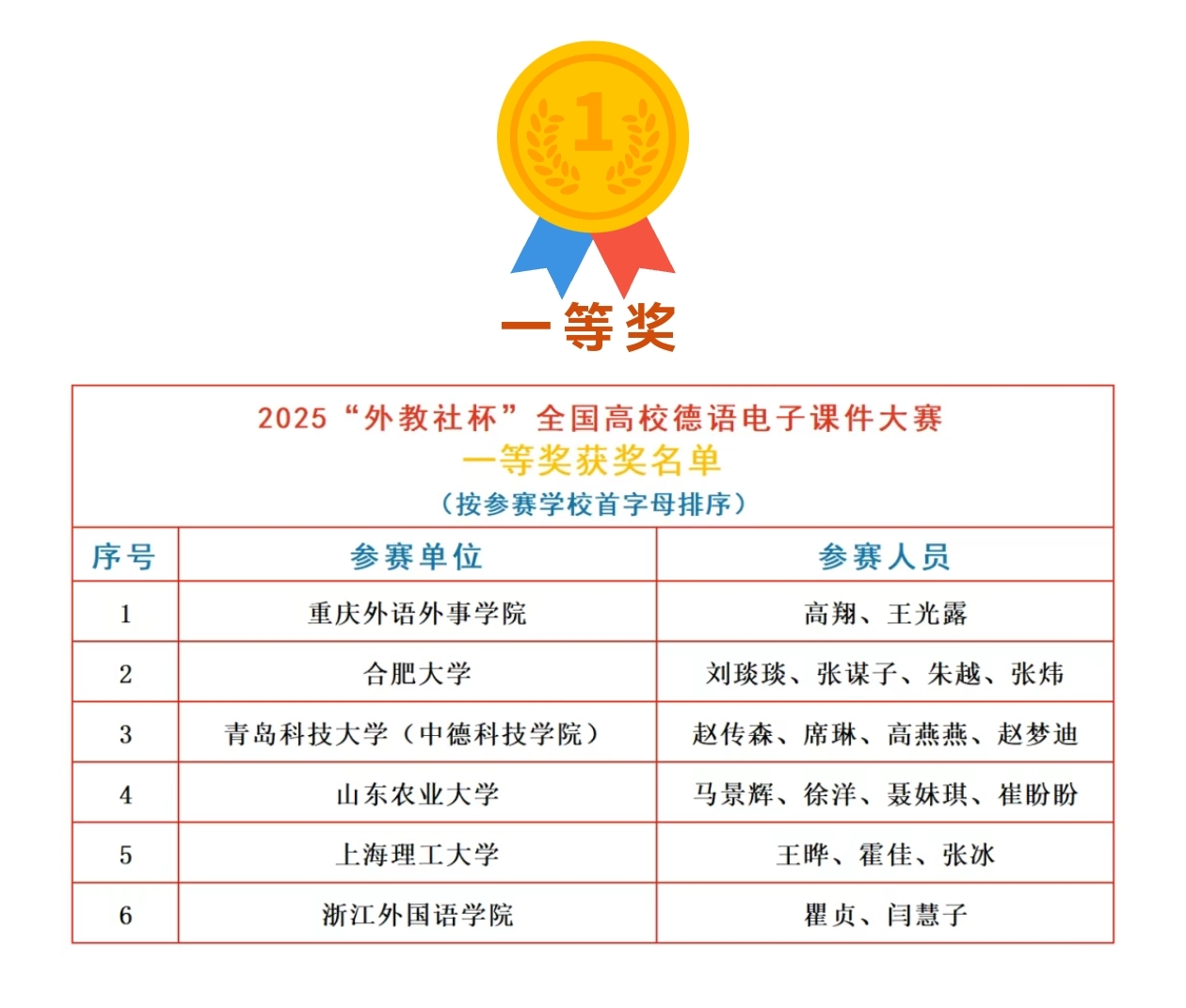 近日,2025“外教社杯”全国高校德语电子课件大赛圆满落幕,公司赵传森、席琳、高燕燕、赵梦迪教师团队凭借“产出导向法”教学设计理念与精湛的数字技术应用能力,从全国众多参赛高校中脱颖而出,一举斩获“全国一等奖”和“最佳创意设计奖”两项重磅荣誉。该团队在全国性权威赛事中实现历史性突破,同时获得两大奖项,不仅是对公司德语教学数字化改革成效与创新能力的高度认可,更是公司教师队伍过硬专业素养的生动彰显。