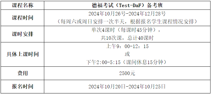 亲爱的同学,三亿体育语言培训与考试中心计划于2024年下半年开办德福考试(Test-DaF)备考班,该课程为线下小班授课,班额15人左右。