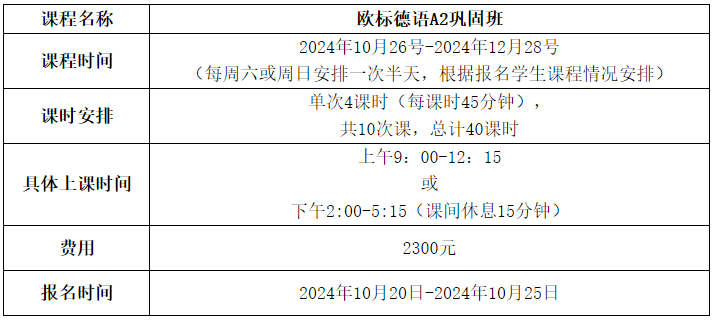 亲爱的同学,三亿体育语言培训与考试中心计划于2024下半年开办欧标德语A2巩固班,该课程为线下小班授课,班额15人左右。