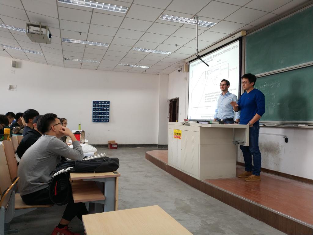 德国帕德博恩大学机械公司C. Lauter博士,博士研究生王政,本周来到三亿体育访问,与公司副经理薄建全教授进行了深入交流,并为机械工程专业2016级同学做了关于留学德国的咨询报告,与同学们互动交流,耐心解答了同学们感兴趣的问题。